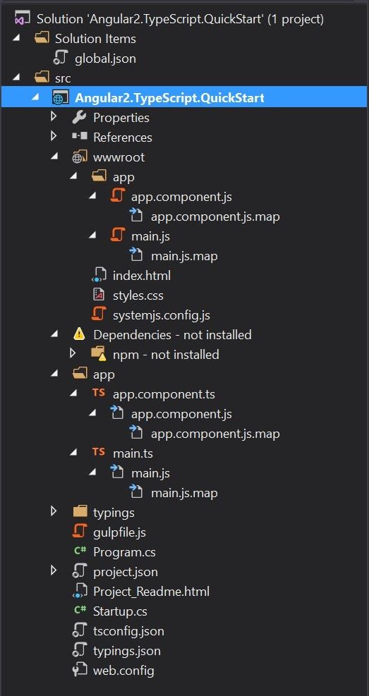 What really happens is, Visual Studio 2015 restores the npm dependencies into a folder named node_modules that is actually outside wwwroot so we cannot serve the files there statically. We cannot also copy all the files in the node_modules folder into wwwroot. It would take a lot of time, and would have to copy a lot of unnecessary files. Also, our app.component.ts and main.ts are not compiled into JavaScript, and don’t rest inside wwwroot so they can’t be served statically either.