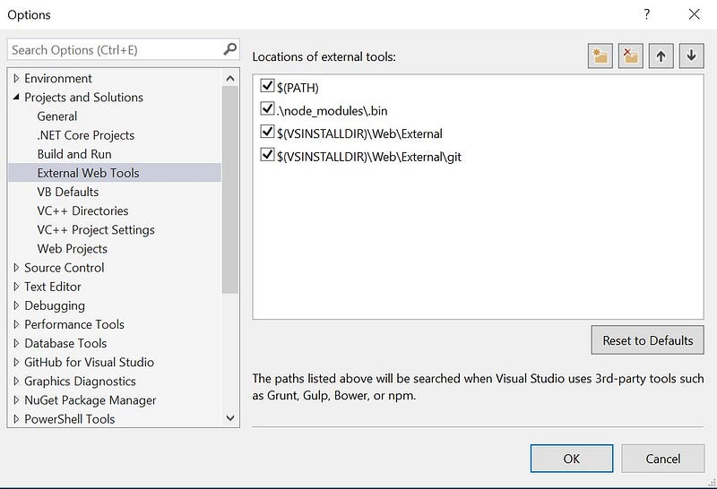 Visual Studio 2015 installs a version of node.js and npm upon installation, and will attempt using the same versions, even if you have installed a more recent version. We have to fix this first. Head to Tools -> Options and in the dialog box that opens, select Projects and Solutions -> External Web Tools. On the right pane, make sure that the $(PATH) option is at the top. You might have to move it to the top if it is not already there.