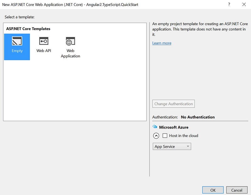 Select the ASP.NET Core Web Application (.NET Core) template, and give a suitable name for the project. You can see that I’ve chosen Angular2.TypeScript.QuickStart as the project and solution name. Once we click OK, we are taken to another screen where we can choose the templates. Let’s start with an Empty template that will create a barebones application scaffold for us to start with. Make sure the Authentication is set to “No Authentication” and the Microsoft Azure “Host in the cloud” checkbox is unchecked. Click OK to have the project created for us.