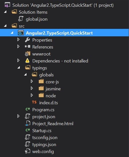 We will try to follow the Angular 2 with TypeScript 5 Minute Quickstart as closely as possible, so that the original page may serve as a reference. However, we will take some deviations, in order to work with Visual Studio 2015 and ASP.NET Core. These are easily identified.
