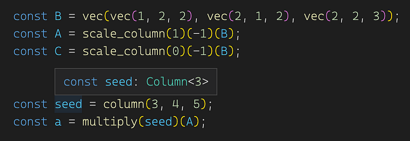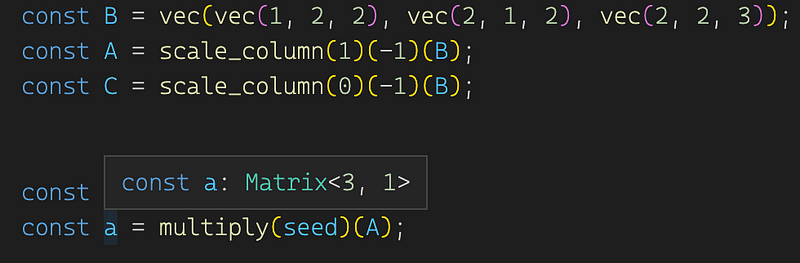Since A is a 3x3 matrix, when it’s multiplied with our seed which is a 3x1 matrix, we get another 3x1 matrix back — another column vector, which is the next PPT. Notice that we used a type alias and TypeScript doesn’t reduce the Matrix<3, 1> into a Column<3>. This is because multiply is typed to return a Matrix<M, P>. But this information is still very useful!