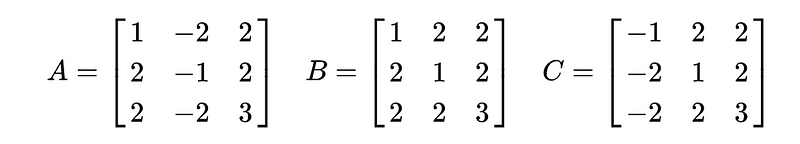 Coming back to our problem, we have 3 matrices A, B, and C, each of which create a specific transform of the input PPT to create another unique PPT. The input PPT is in the form of a column vector. And we need to multiply that with these transforms. I wonder what we’ll get — but TypeScript should be able to tell us.