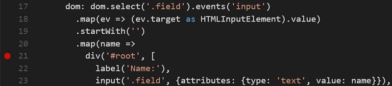 If you setup Visual Studio Code as mentioned above, we can debug TypeScript source now, because we configured Webpack to use sourcemaps! To try this out, open up our app.ts in the src folder, and place a breakpoint on line number 21: