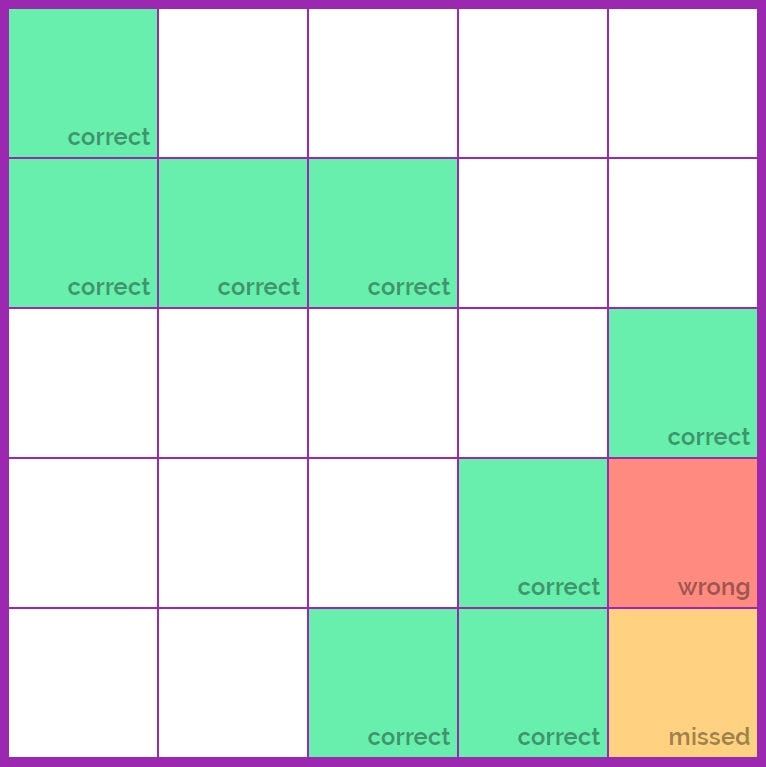 - When 9 cells have been selected, the result should be displayed graphically, with the correct, wrong, and missed cells displayed distinctly.