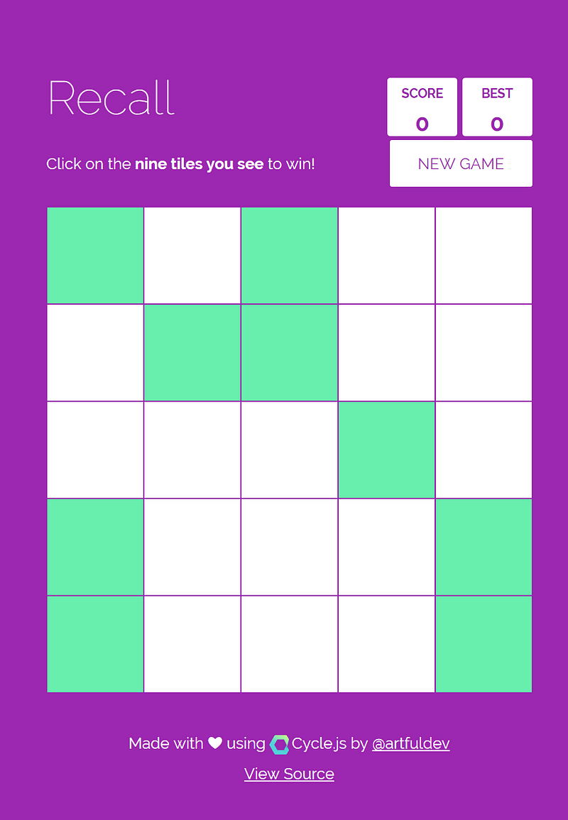 It is a simple app, with a square grid of 25 squares. When a new game starts, 9 cells are selected at random, and shown to the user for a few seconds. Afterwards, the question is hidden, and the user has to select the 9 cells correctly, by clicking on them again. Once the user selects 9 cells, we compare them with our question. If he got all of the 9 cells right, he is awarded a score of 1.