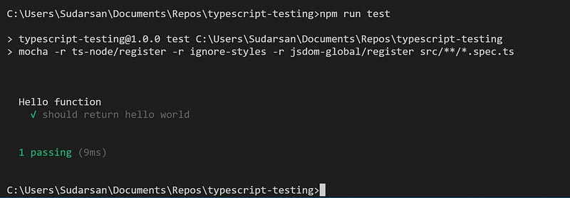 We change our test script to provide the correct value for module for ts-node and mocha to work their magic with our TypeScript tests: