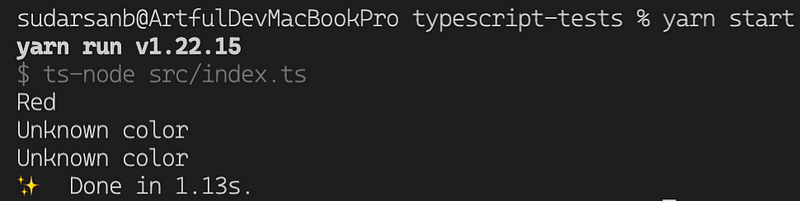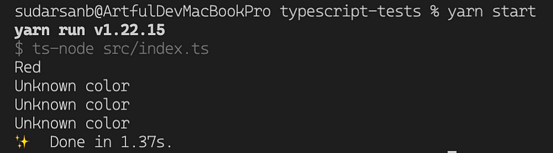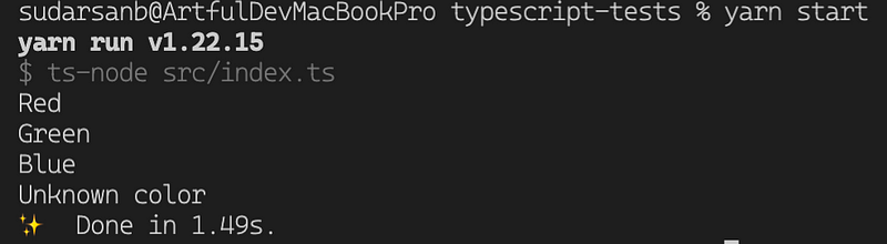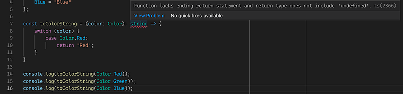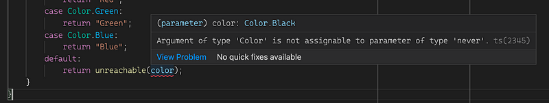 Notice that even though we mentioned that color is of type Color, TypeScript didn’t warn us about not handling cases that are statically available like Color.Green and Color.Blue.