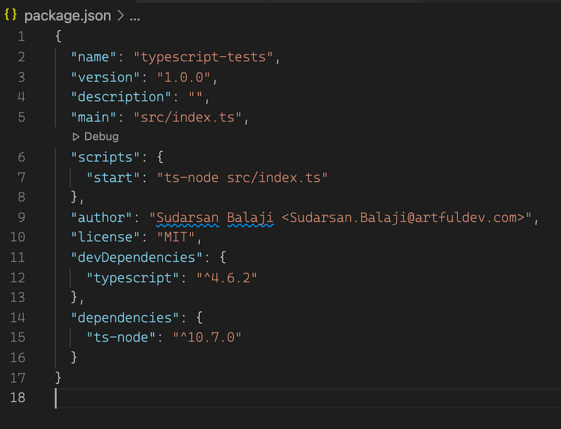At this point, we’re going to add a start script to our package.json which reads “ts-node src/index.ts”. Here’s how my package.json looks, for reference (my project name is different):
