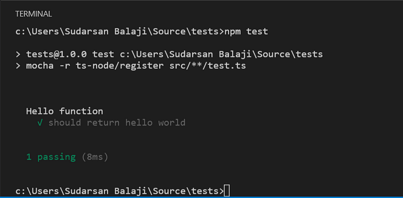 We just registered ts-node with mocha, and the last parameter specifies that mocha should run tests in the src folder with the name test.ts. Feel free to modify this to suit your projects.